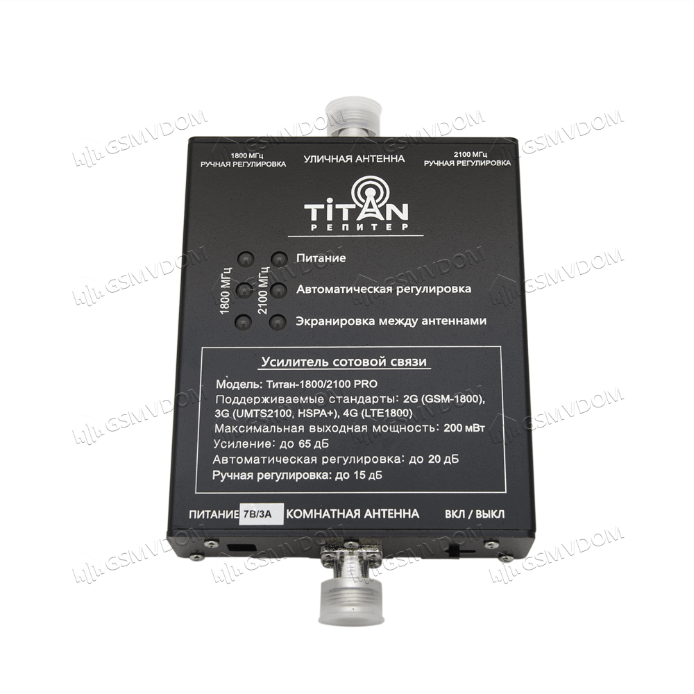 Усилитель сигнала связи Titan-1800/2100 PRO комплект (LED) - прибор, основная функция которого заключается в стабильной передаче сигнала от источника к приемнику. Применяется на объектах, расположенных на удалении от вышек оператора. Устройство работает в двух диапазонах, обеспечивает усиление сигнала до 78 дБ. Подойдет для установки в жилых и производственных помещениях площадью до 350 кв.м. Предусмотрена защита от перегрузки, система охлаждения естественная.